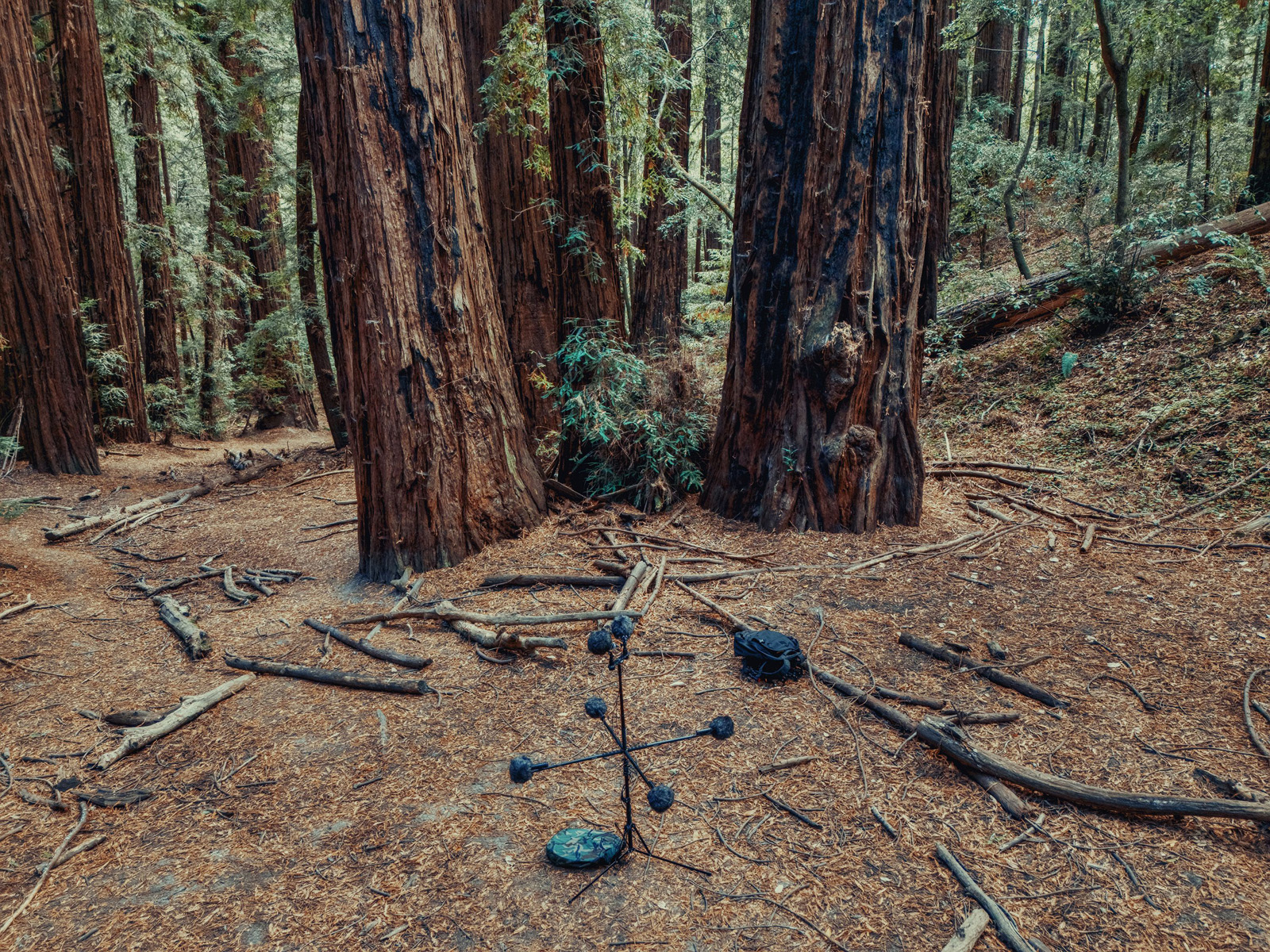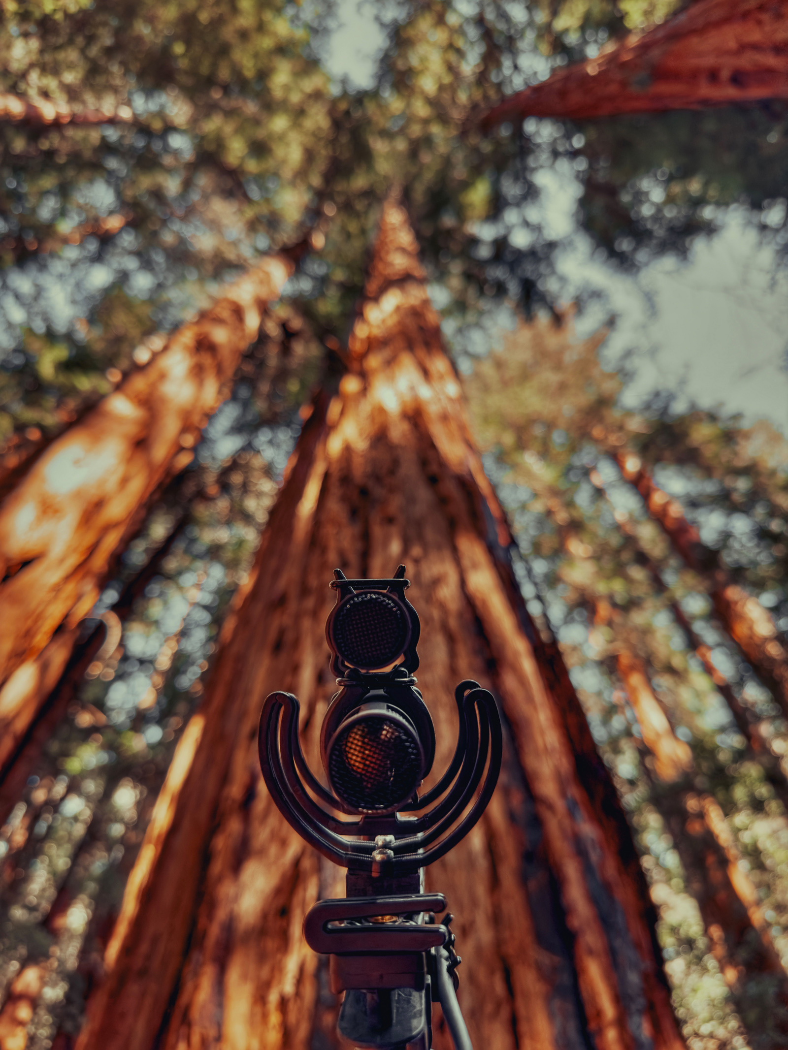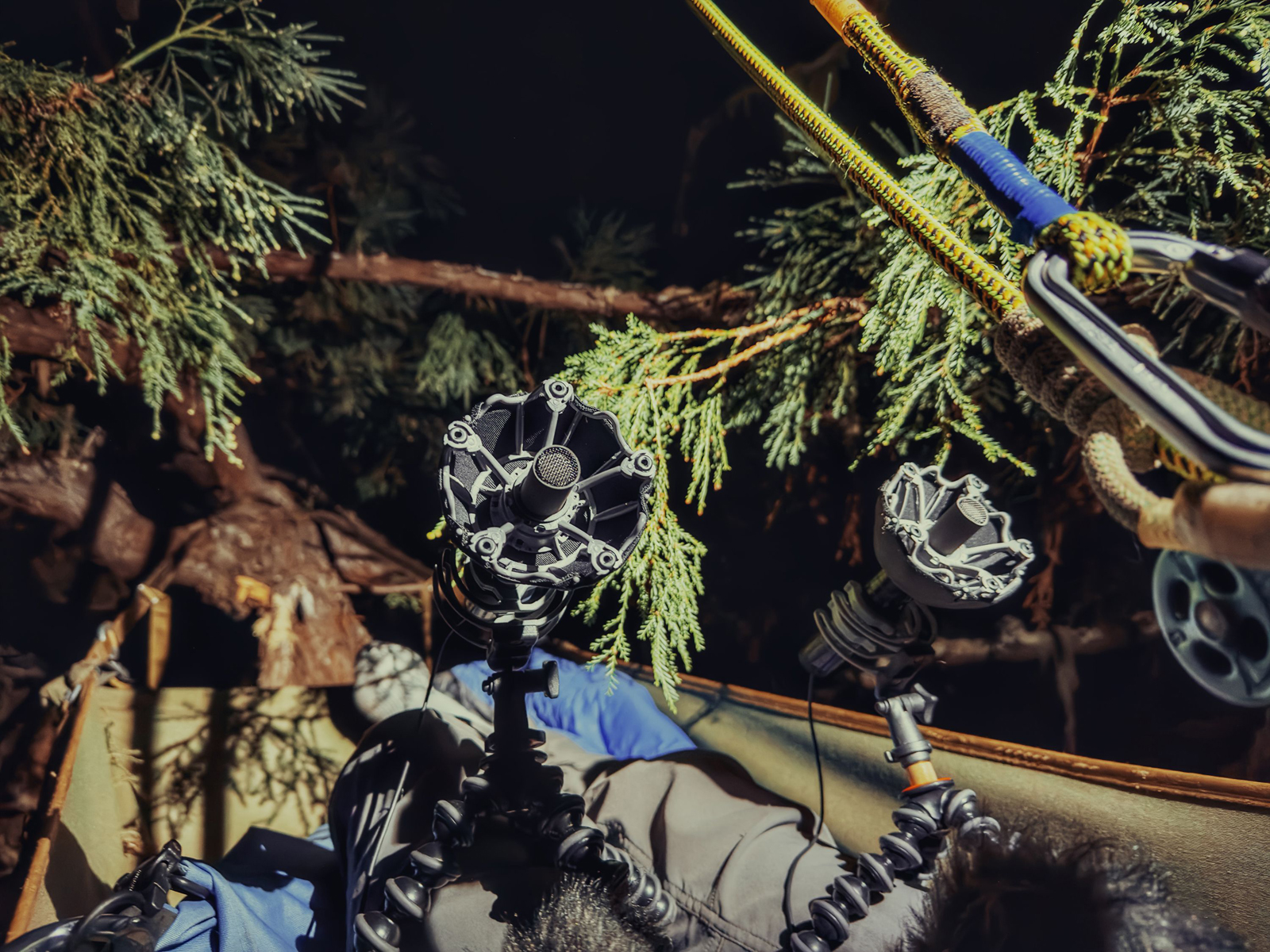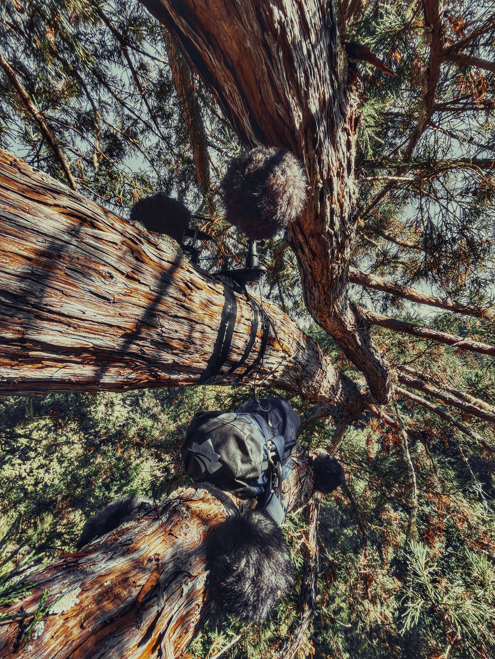 Сетап з чотирьох Sennheiser MKH 8040 в конфігурації подвійного ORTF біля підніжжя секвої. Ці мікрофони записували зовнішні звуки, а звуки всередині дерева писали контактні мікрофони на стовбурі