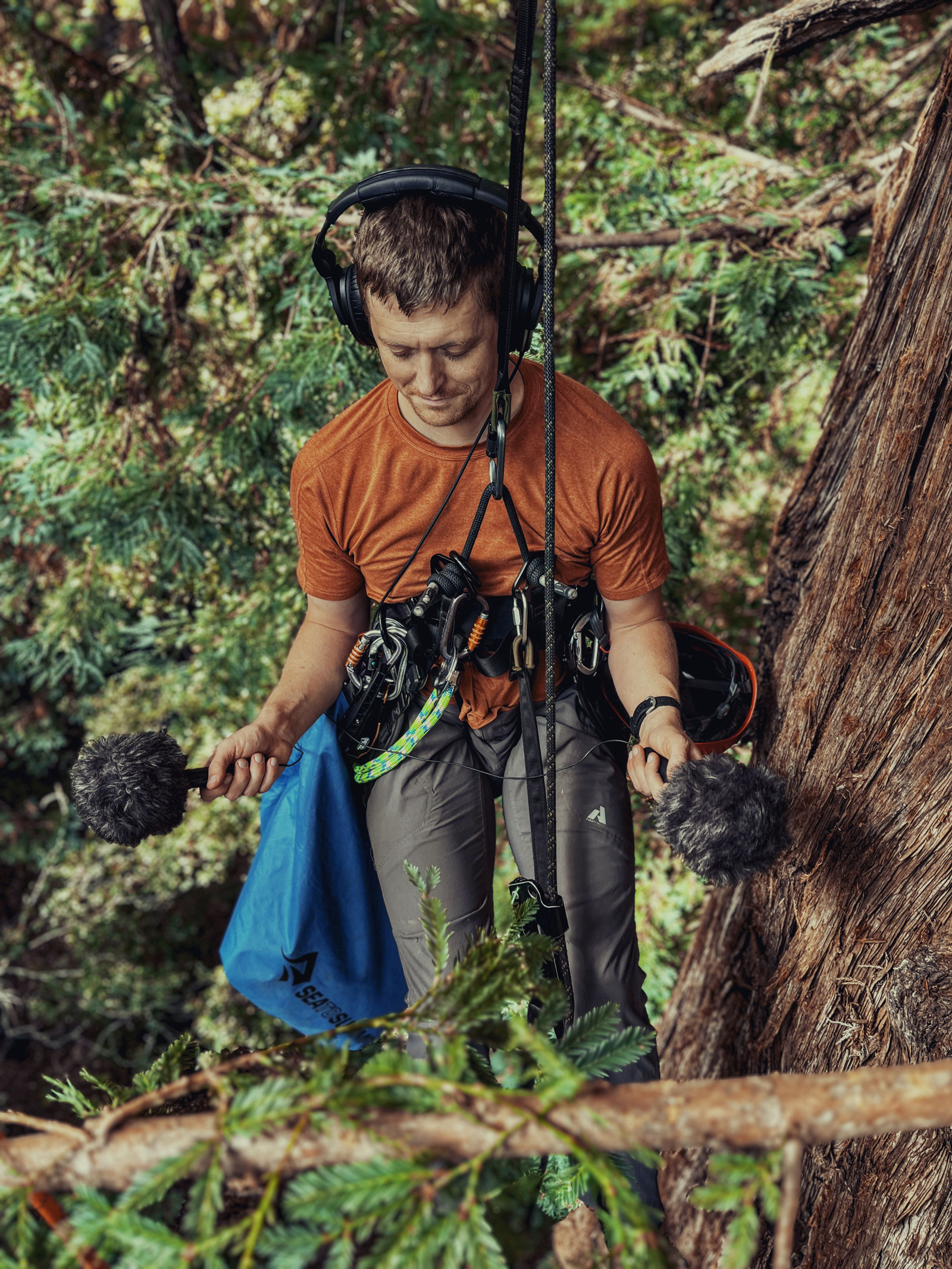 "Скажу вам, що це досить важко - по декілька годин поспіль висіти в обв'язці й при цьому ще й намагатися не лише правильно тримати мікрофони, а й вчасно міняти батарейки і SD-карти. Та можливість записати звуки у кроні дерева й потім зіставити їх зі звуками, записаними біля його підніжжя, однозначно варта таких зусиль".