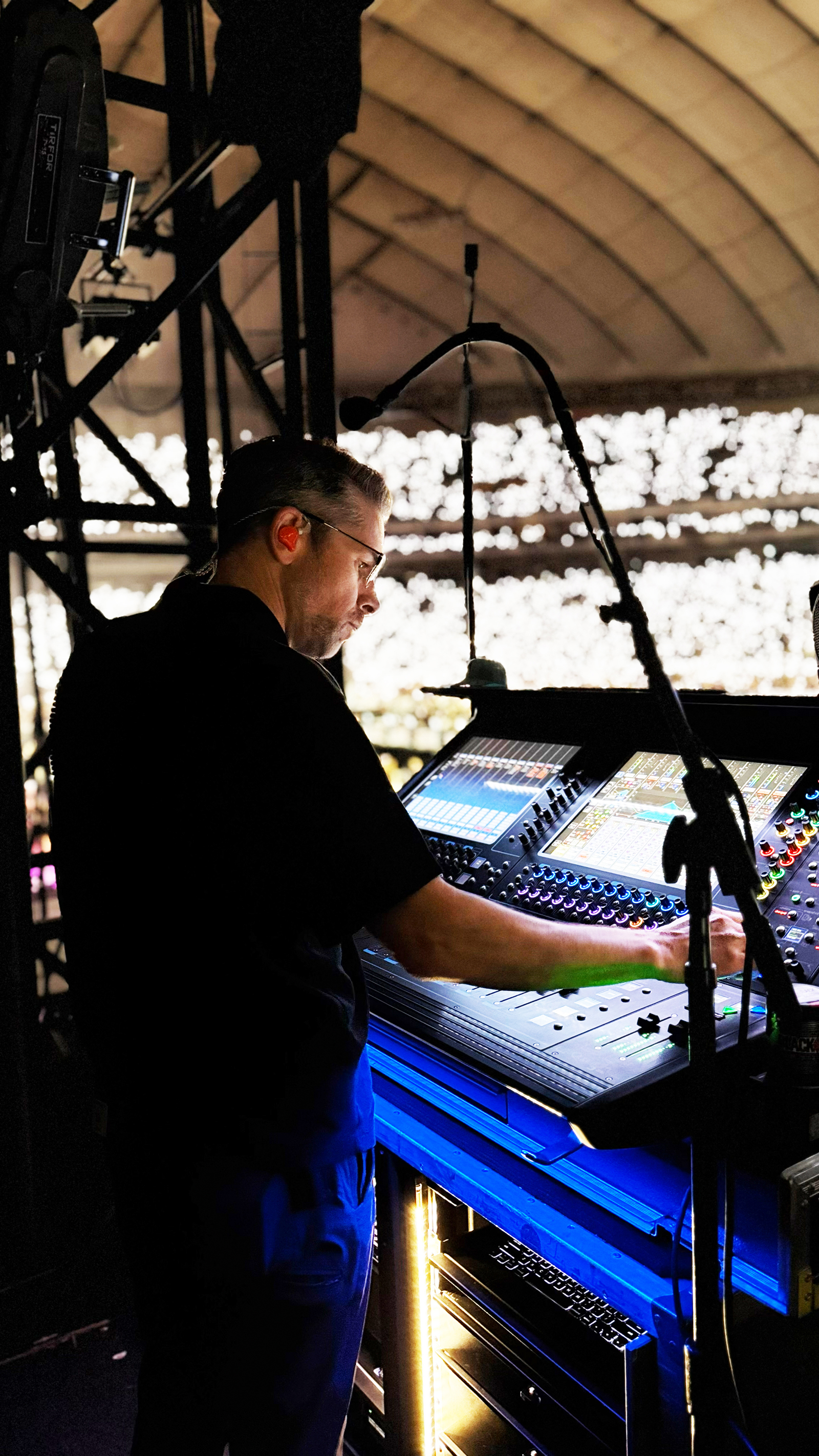 Моніторний звукорежисер Дейв Рупш за своєю робочою консоллю контролює мікс Maroon 5 під час виступу на Tokyo Dome, 2025 рік (фото Трелоні Роуз)