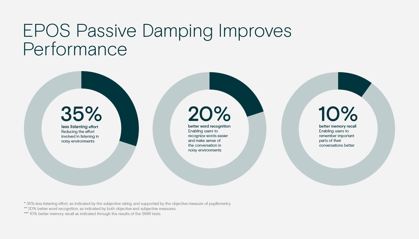 Аналіз результатів тестів показав, що завдяки технології пасивної шумоізоляції користувачі гарнітур EPOS докладають значно менше зусиль для прослуховування аудіоінформації, а також краще розпізнають слова і краще їх запам'ятовують.