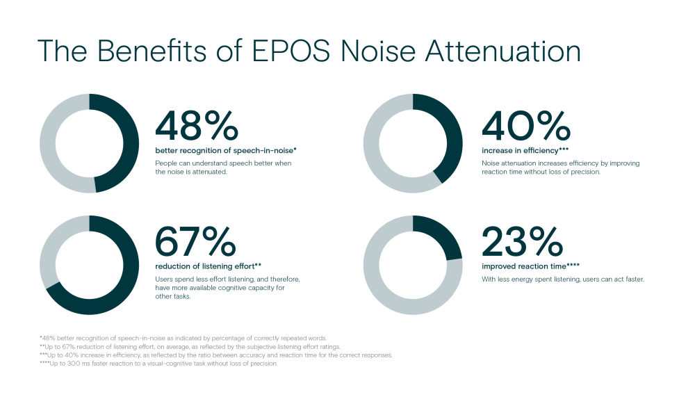 Цей офіційний документ містить результати клінічного дослідження, метою якого було визначити переваги технології пасивної шумоізоляції, що застосовується у гарнітурах Epos, і зокрема визначити, як саме вона впливає на здатність користувачів чути й розуміти мовлення у шумному оточенні, скільки зусиль вони для цього прикладають, а також наскільки швидко й точно при цьому вони здатні виконувати певні візуальні завдання.