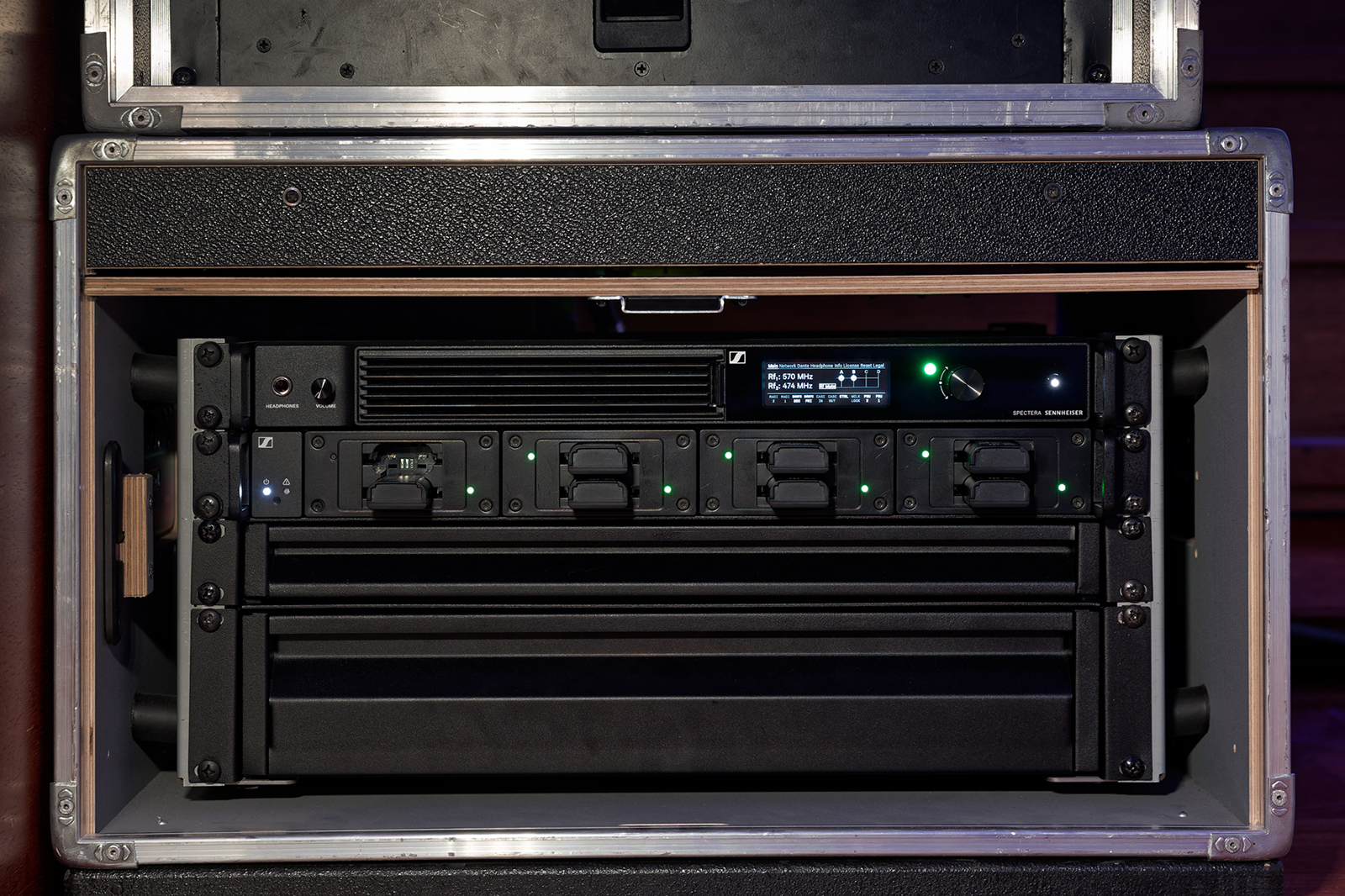 Обидві антени DAD, що на концертах розташовуються на стійках праворуч та ліворуч від сцени, до базової станції Spectera підключені звичайними мережевими кабелями і живлення отримують через PoE. Сама базова станція з цифровою консоллю звукорежисера з'єднана через інтерфейс Dante, а моніторинг та керування всією системою, зокрема й у дистанційному режимі виконується через онлайн-сервіс Sennheiser Spectera WebUI просто з робочого ноутбука FoH. Літій-іонні акумуляторні блоки BA 70 бодіпаків SEK заряджаються на зарядній станції Sennheiser L 6000.