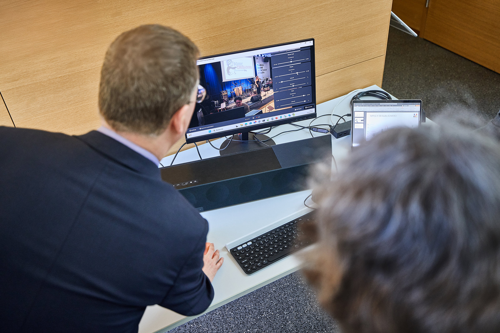 Перша у світі демо-станція ATEME для передачі об'єктноорієнтованого аудіо: на екрані – живий виступ групи та елементи керування для компонування аудіооб'єктів