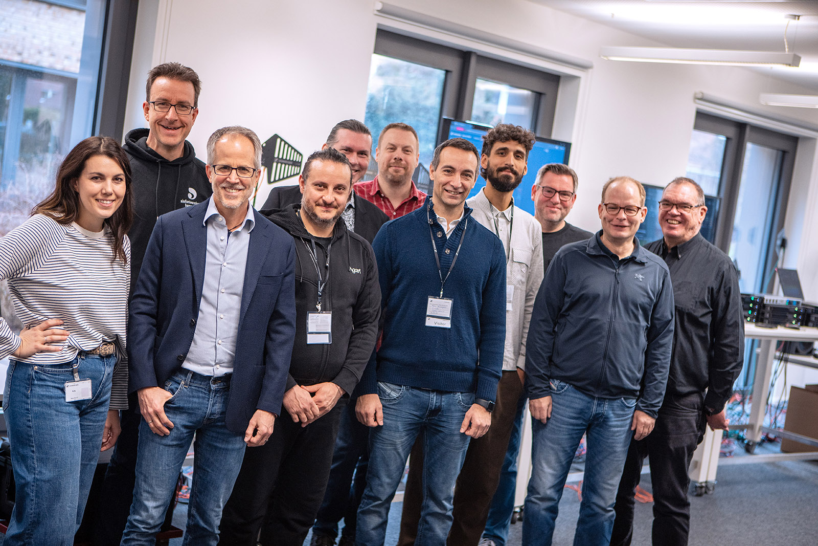 Робоча зустріч у Ведемарку (зліва направо): Корінна Троян (директорка з продажу у регіоні EMEA), Себастьян Георгі (старший інженер-розробник відділу технологій передачі даних), генеральний директор компанії доктор Андреас Зеннхайзер, Доменіко Черкуа (керівник відділу систем аудіо освітлення в Agora), Жером Застров (старший менеджер з цифрового моделювання), Йонас Несбі (інженер з технічних програм), Фабіо Фумагаллі (представник Exhibo, компанії-партнера Sennheiser), Валеріо Мотта (керівник проєкту Eurovision Song Contes в Agora), Ян Ватерманн (старший системний архітектор), Кевін Юнг (архітектор системних рішень), Фолькер Шмітт (керівник відділу технічного інжинірингу)