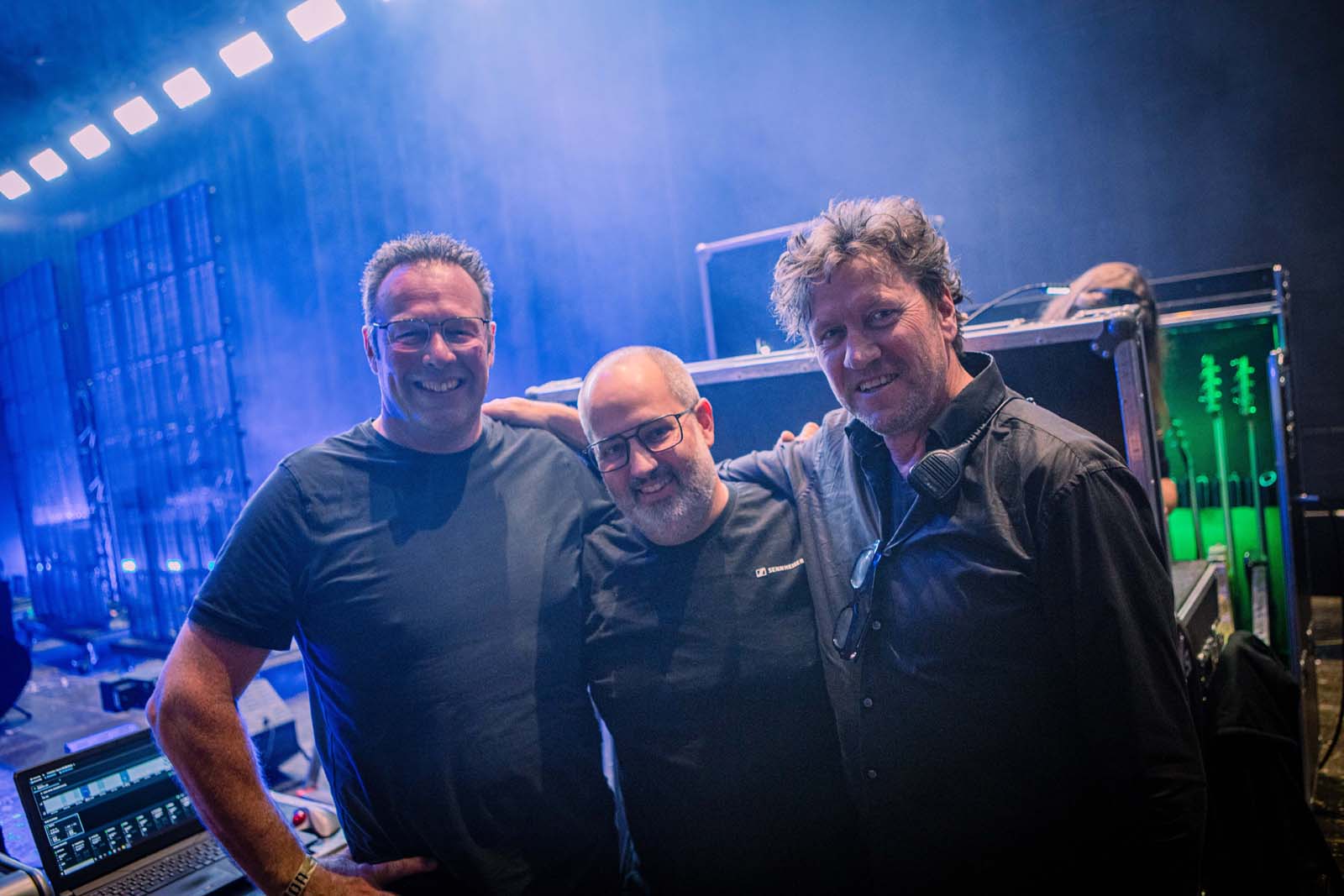 Моніторний звукорежисер Єлмер Дейкстра (зліва), інженер відділу техпідтримки Sennheiser Вінсент Тільгенкамп (в центрі) та FoH-звукорежисер гурту Марті Брюгманс (справа)