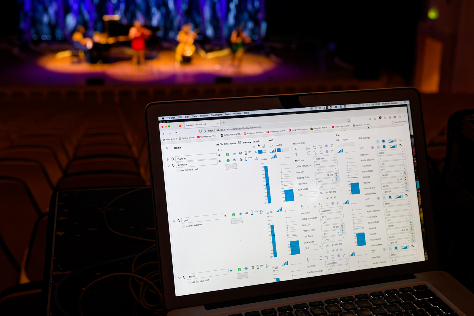 Ангеліка Бахманн (засновниця Salut Salon та незмінна перша скрипка квартету), Альвіна Лахьяні (скрипка), Марія Велл (віолончель) та Крістійна Рокашевич (фортепіано) виступали з двобічноспрямованими бодіпаками Spectera SEK з каналами для систем персонального моніторингу та вокалу. Ще чотири бодіпаки SEK задіяні були для інструментальних мікрофонів віолончелі, акордеона та рояля.