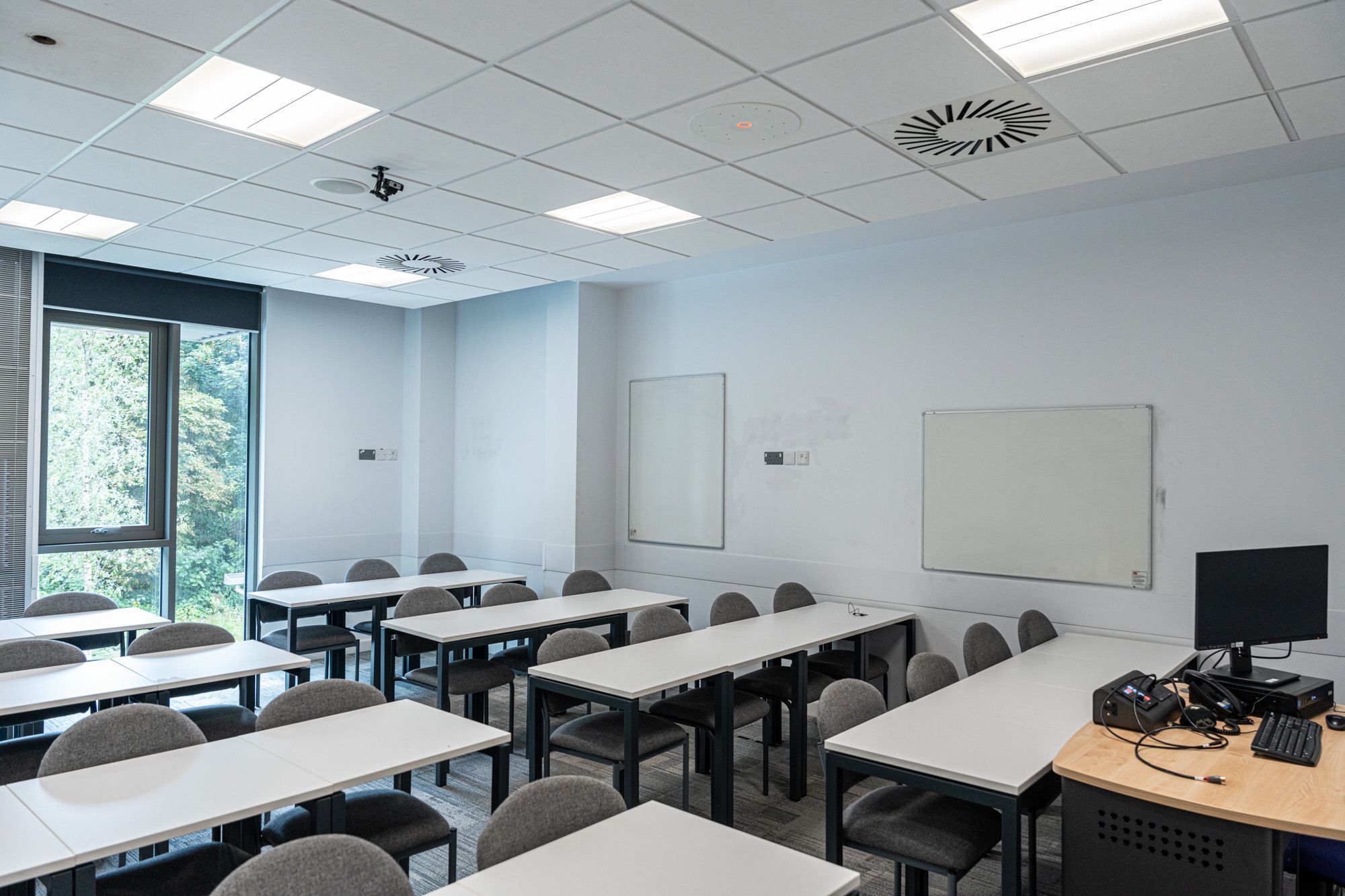 А у менших за площею класах університету встановлені нові стельові конференц-системи TeamConnect Ceiling Medium (TCC M), котрі теж оснащені технологією автоматичного спрямування мікрофонів, втім від TCC 2 відрізняються меншими матрицями (у них 16 капсюлів замість 28), а отже й компактнішими розмірами. Системи обох моделей, і TCC 2, і TCC M, повністю інтегровані до AV-інфраструктури університету, і зокрема підключені до систем централізованого керування обладнанням Extron.