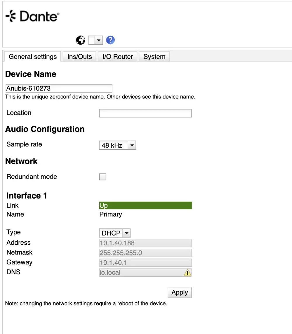 Основна ж перевага Dante полягає передусім у можливості задіювати для передачі високоякісного аудіосигналу загальнодоступне IT-обладнання. Все, що потрібно для нормальної роботи всієї системи - це стандартні гігабітні комутатори та кабелі CAT5e або CAT6. При цьому всі підключені до такої мережі пристрої зручно відображаються у безплатному додатку Dante Controller від Audinate, плюс, у ньому ж можна швидко організовувати з'єднання типу point-to-point, просто призначаючи вихід одного пристрою на вхід іншого.