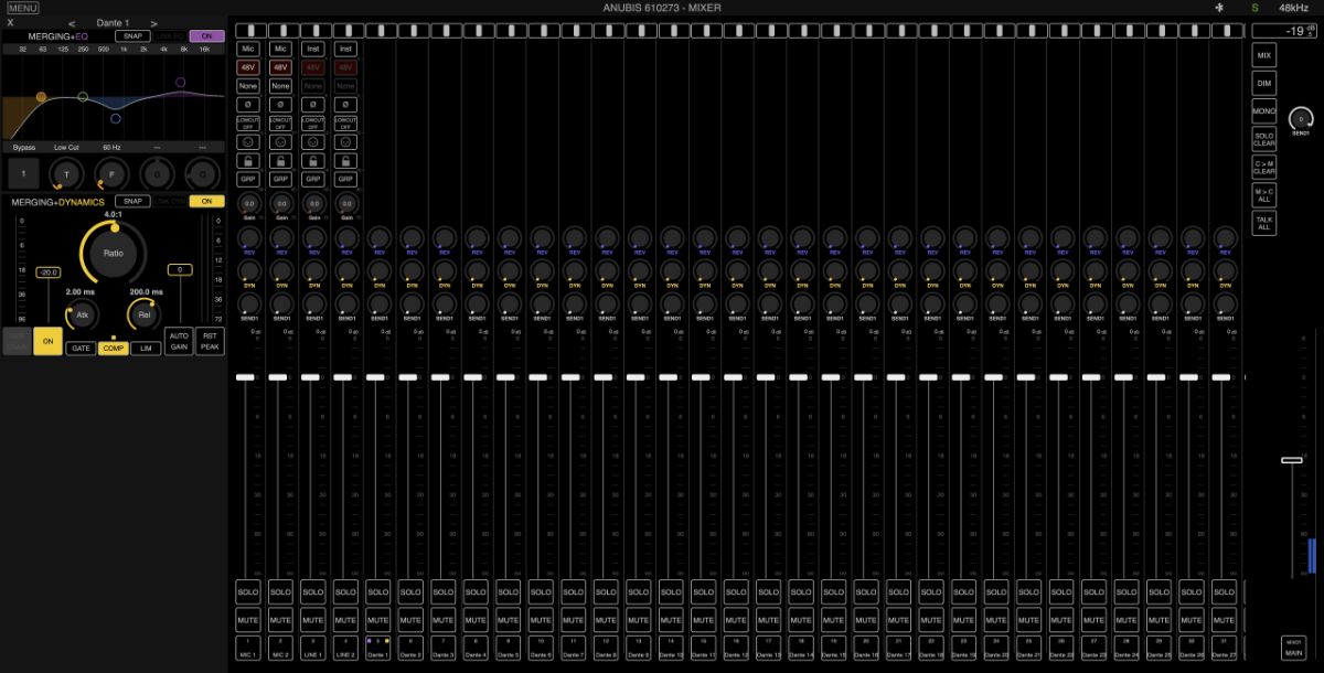 Фахівці Merging люб'язно надали нам на тестування одразу декілька таких систем, зокрема найновіші інтерфейси Merging Technologies Anubis та Hapi Mk III, а також Neumann MT 48 (і треба сказати, що освоювати, оцінювати можливості та працювати з цієї апаратурою є справжнім задоволенням). Всі три моделі - MT 48, Anubis та Hapi Mk III - мають маркування "Dante-Ready". Це означає, що після простої процедури активації кожен з пристроїв може працювати у мережі Dante.