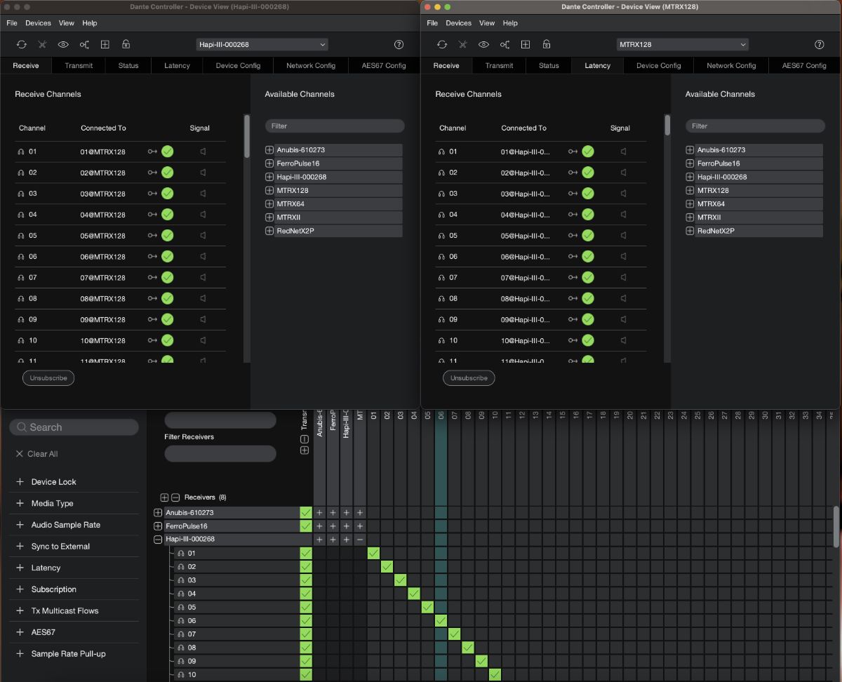 Кожен Anubis, MT 48 чи Hapi Mk III підтримує максимум 64х64 канали Dante. Під час роботи з останнім, коли, наприклад, конче потрібно встановити дві карти DigiLink у Hapi Mk III для підключення до системи Pro Tools HDX2, це може завадити. У такому випадку радимо залишитися на протоколі RAVENNA, оскільки він дає змогу використовувати всі 128х128 каналів Hapi Mk III.