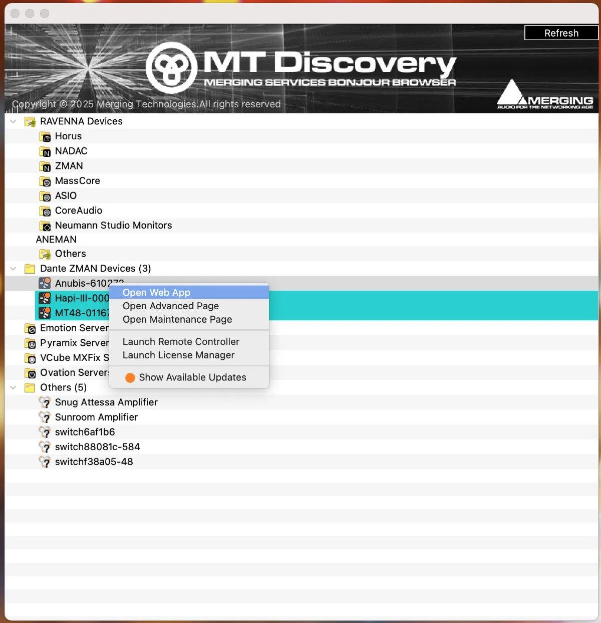 Також варто знати, як саме у Merging виконуються конфігурація, оновлення та обслуговування пристроїв. Підхід фактично децентралізований і не передбачає єдиного вікна для налаштування маршрутизації каналів та апдейтів. Програма MT Discovery показує список пристроїв у мережі (через протокол Apple Bonjour). Звідти правим кліком миші по кожному окремому пристрою і відповідне контекстне меню можна перейти у вебдодаток (Web App) на сторінку розширених налаштувань (Advanced page) або на сторінки обслуговування (Maintenance page). Вебдодаток для Anubis та MT 48 також відкриває доступ до потужного мікшера та базових налаштувань пристрою - саме тут користувач і проводить майже увесь час, коли працює з пристроєм