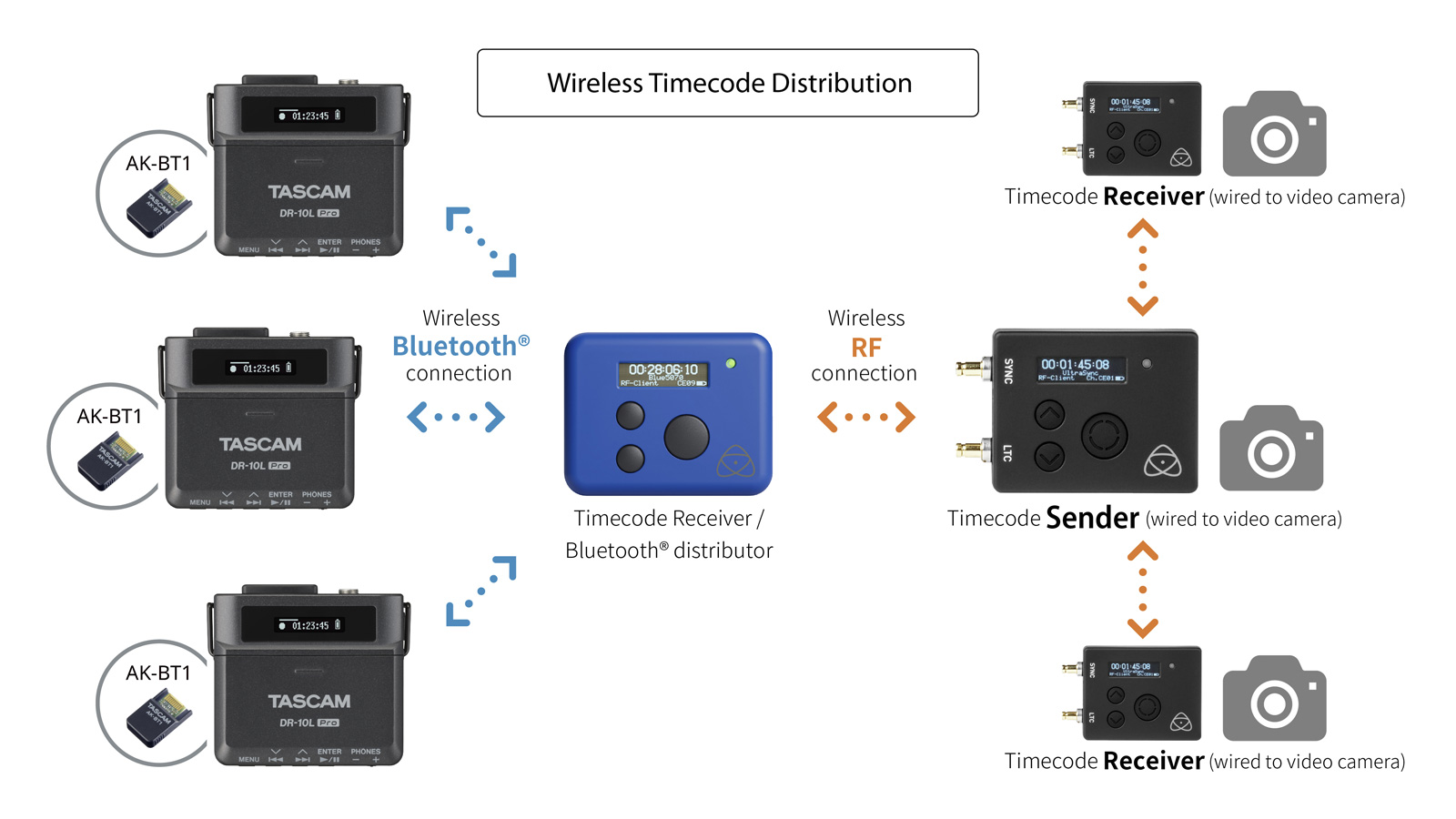 Через додатковий Bluetooth-адаптер AK-BT1 рекордер Tascam DR-10L Pro таймкоди із сумісними системами Atomos синхронізує по бездротовому каналу. Завдяки цьому аудіо та відео на монтажі узгоджуються якнайточніше, зокрема й коли записувалися вони окремо (камера без звуку).