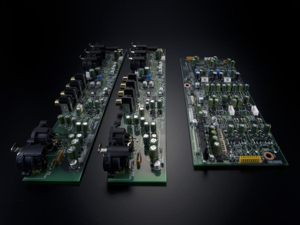 В Esoteric F-01 ліва і права вхідні плати попереднього підсилювача (на фото вони зліва та у центрі) і плата передпідсилювача (справа) повністю незалежні. А для покращення звуку плата випрямлення потужності та плата системи керування ізольовані від передпідсилювача