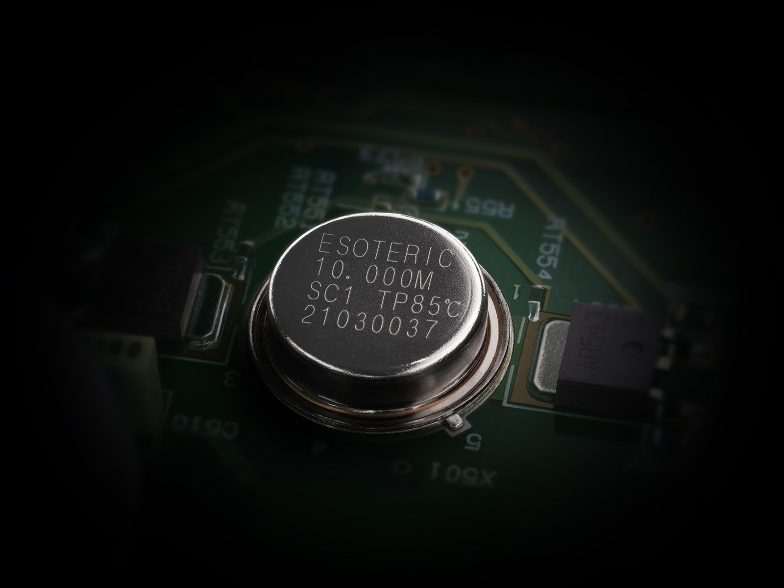 Оскільки кристали кварцу генерують тактові сигнали через вібрацію або резонанс, між фізичними властивостями базового матеріалу та якістю звучання існує глибока кореляція. Великі кристали, як правило, створюють більш високий рівень перетворювача, на який менше впливає високий опір у схемі. Більші кристали також генерують більш стабільні коливання. Тому в Esoteric виконується ретельний відбір і контроль кожної деталі на кожному без винятку етапі її виробництва - все для того, щоб створити генератор з оптимальними електрофізичними характеристиками, котрий дає змогу отримати максимально якісний звук.