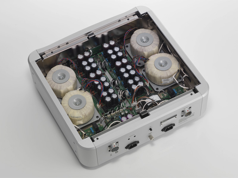 Конструкція блоку живлення теж складна і багаторівнева. Плати й трансформатори встановлені на різних рівнях шасі, завдяки чому вібрації від трансформаторів не лише мінімальні, але й ніяк не досягають плат. Пази для кріплень трансформаторів вирізані лазером - через них вібрація більш контрольовано спрямовуються назовні та ефективно поглинається опорами корпусу, що мають спеціальну вібропоглинаючу конструкцію.