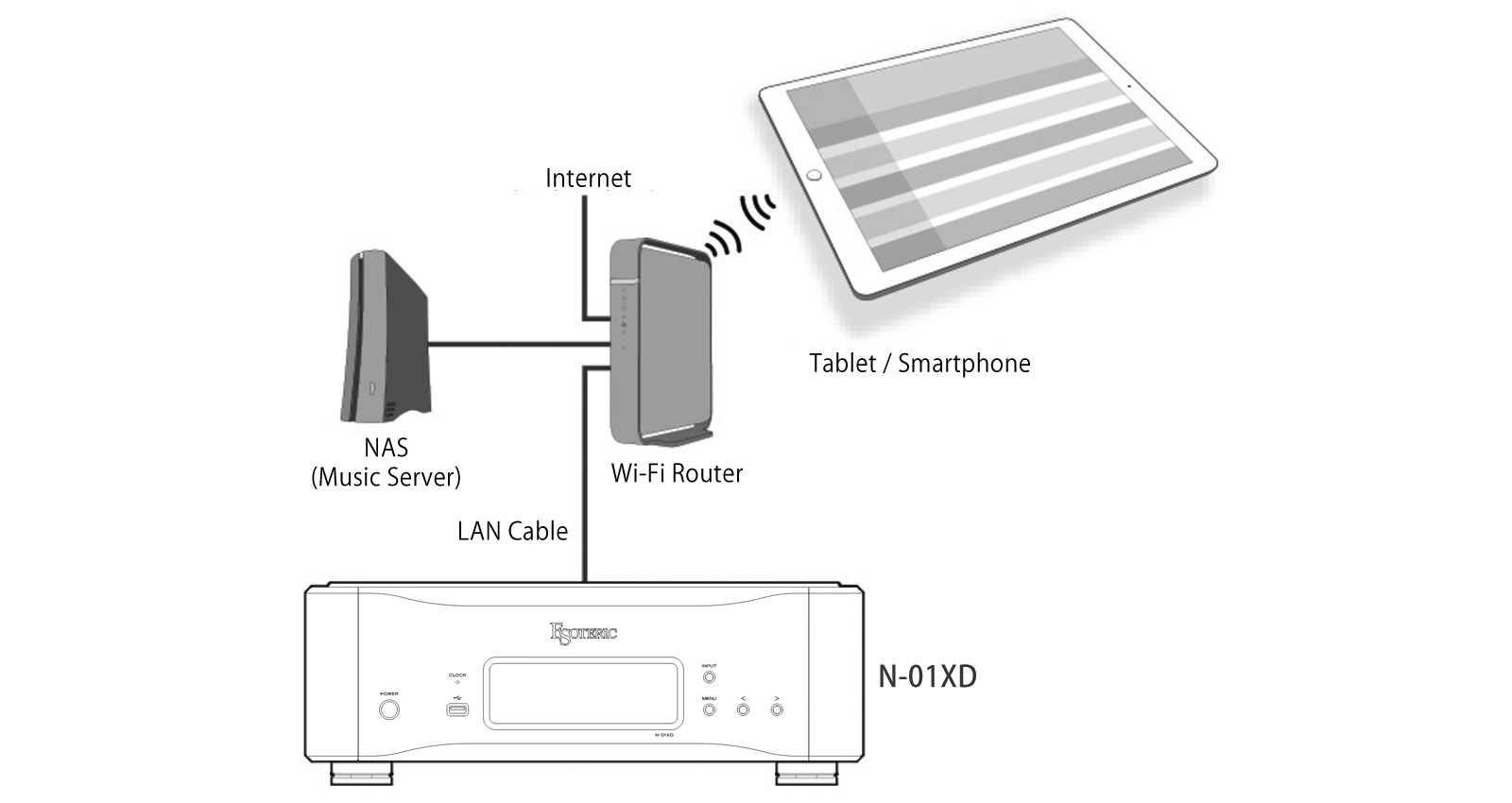 Універсальний мережевий модуль N-01XD відкриває доступ до колекцій високоякісного аудіо і дає змогу насолоджуватися вишуканим звуком, як зручніше. Для цього окрім самого плеєра потрібні лише вихід до Мережі (приміром, WiFi-роутер), смартфон чи планшет і NAS (мережевий накопичувач) з музичною бібліотекою.
