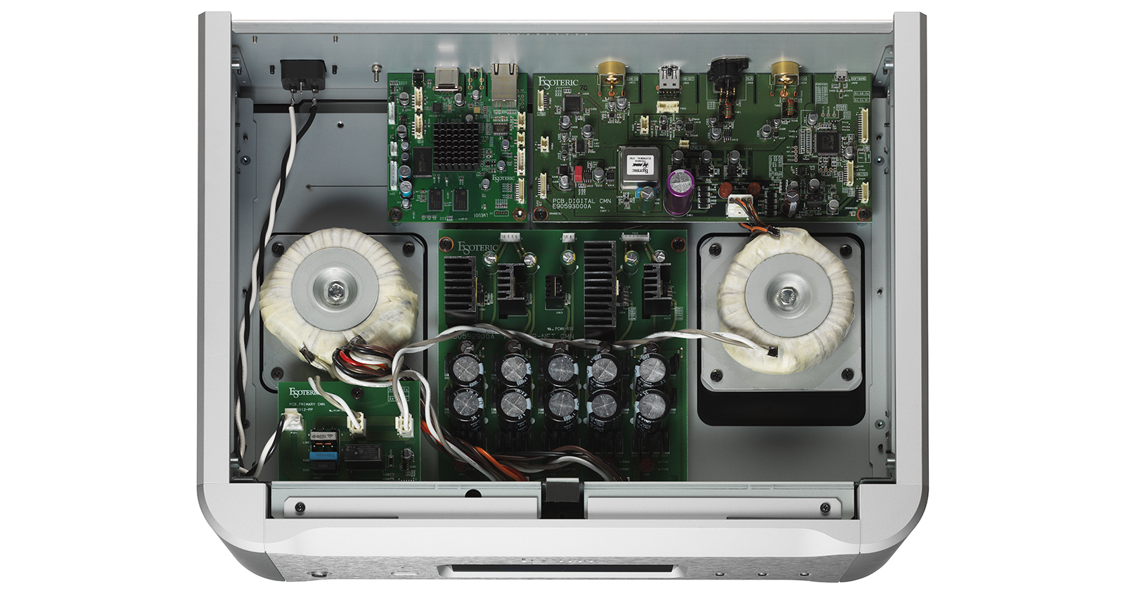 Аудіотранспорт Esoteric N-03T має два силові трансформатори високої потужності з тороїдальними сердечниками, по одному для мережевого модуля та для цифрової схеми.