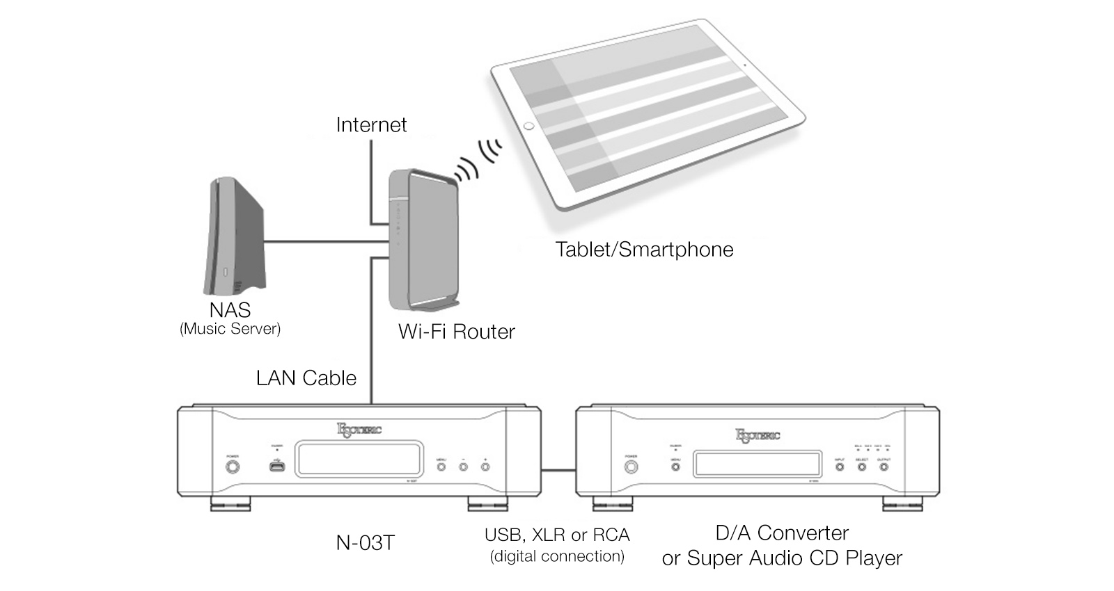Esoteric N-03T - це високоякісний аудіотранспорт, що спеціально оптимізований для роботи із зовнішнім ЦАП (наприклад, Esoteric серії D) та програвачами Super Audio CD (скажімо, Esoteric серії K) через USB-з'єднання, відкриває доступ до колекцій високоякісного аудіо і дає змогу насолоджуватися вишуканим звуком зі справжнім комфортом. І потрібні для такої аудіосистеми всього лише вихід до Мережі (приміром, WiFi-роутер), смартфон чи планшет і NAS (мережевий накопичувач) з музичною бібліотекою.