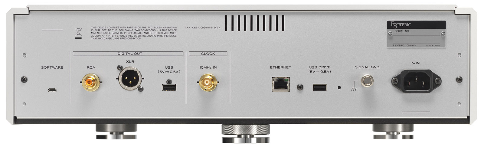Порт USB, що ним оснащений N-03T, забезпечує рівень якості цифрового сигналу до DSD 22,5 МГц та PCM 768 кГц/32 біт, а отже цей аудіотранспорт до сумісного USB-ЦАП або програвача SACD-дисків підключати можна просто через USB. Втім модель також має цифрові виходи XLR і RCA, котрі підтримуючи PCM до 192 кГц/24-біт, а DSD до 2.8 МГц (DoP).