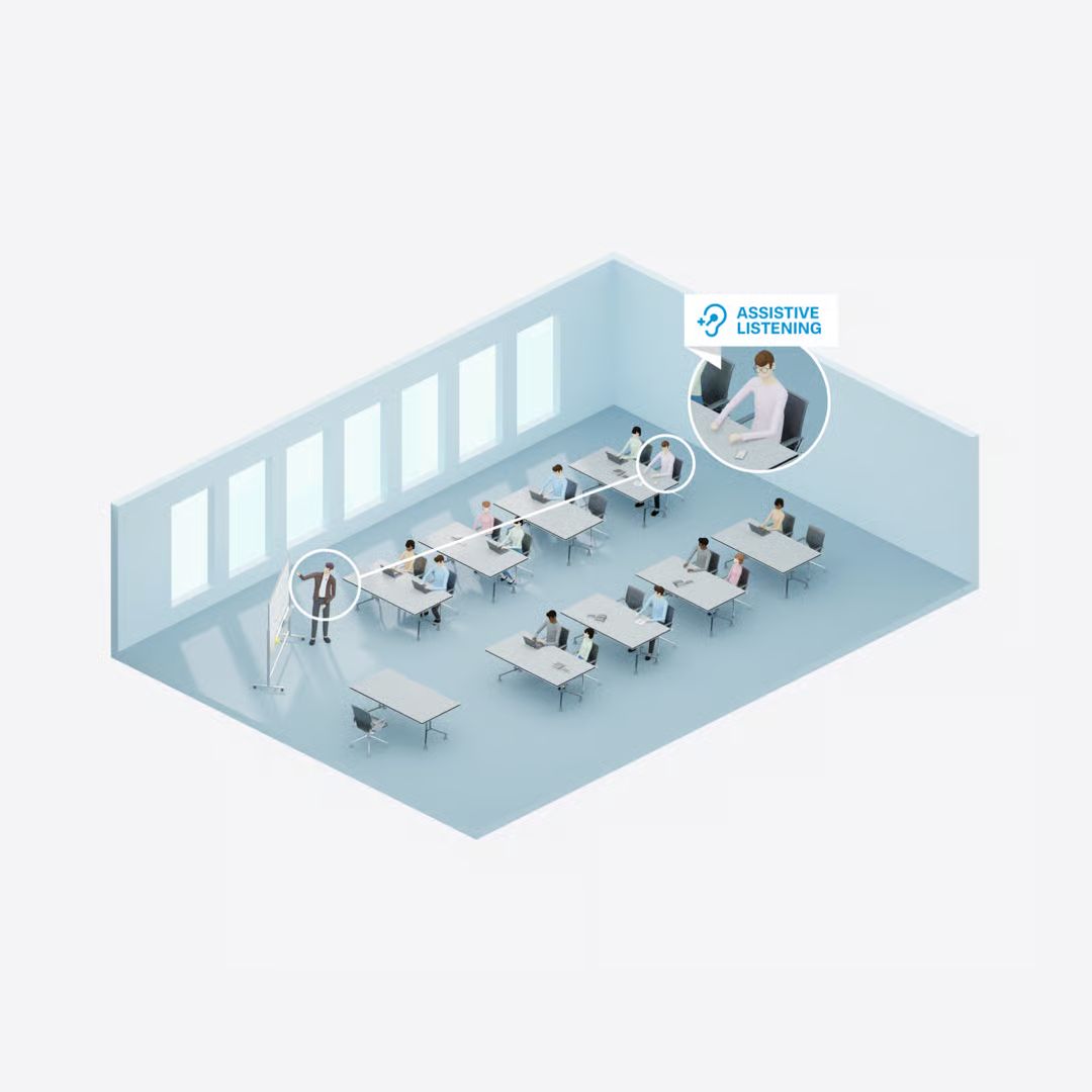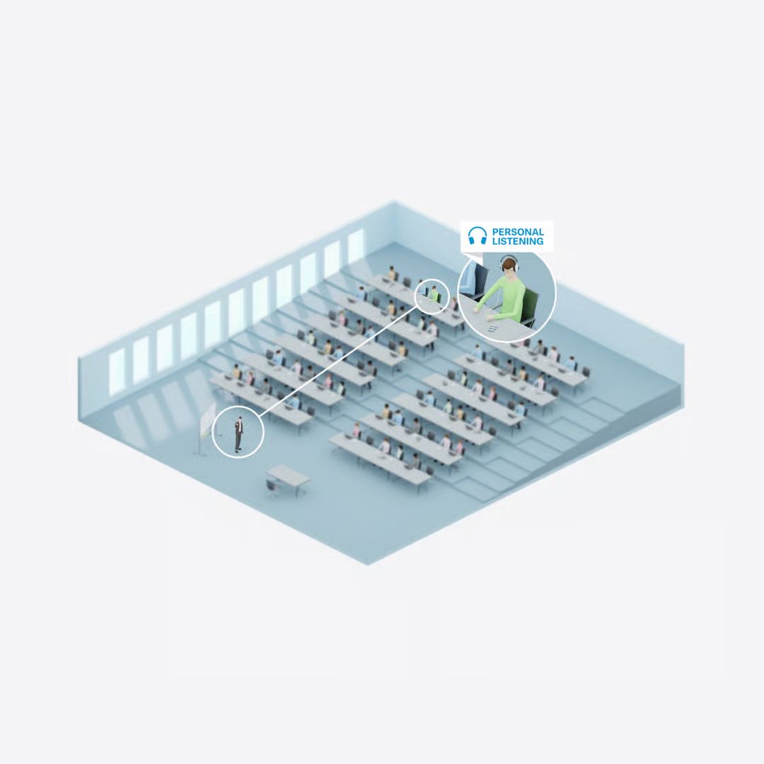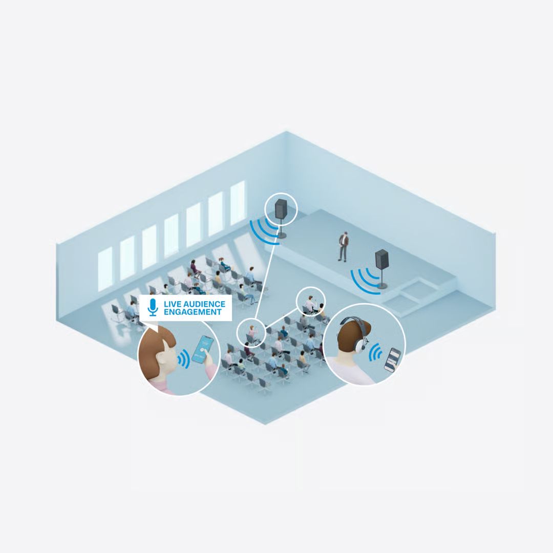 Режим допоміжного прослуховування й функція Audience Mic забезпечують безпосередній та постійний контакт між промовцями та усією аудиторією. І найголовніше, слухачам для цього вистачає їх власних смартфонів. Якість аудіосигналу стабільно висока в усьому приміщенні, а режими прослуховування кожен зі слухачів налаштовує індивідуально. При цьому система однаково ефективно працює не лише через смартфони, а й через навушники, слухові апарати та персональні індукційні шийні петлі.