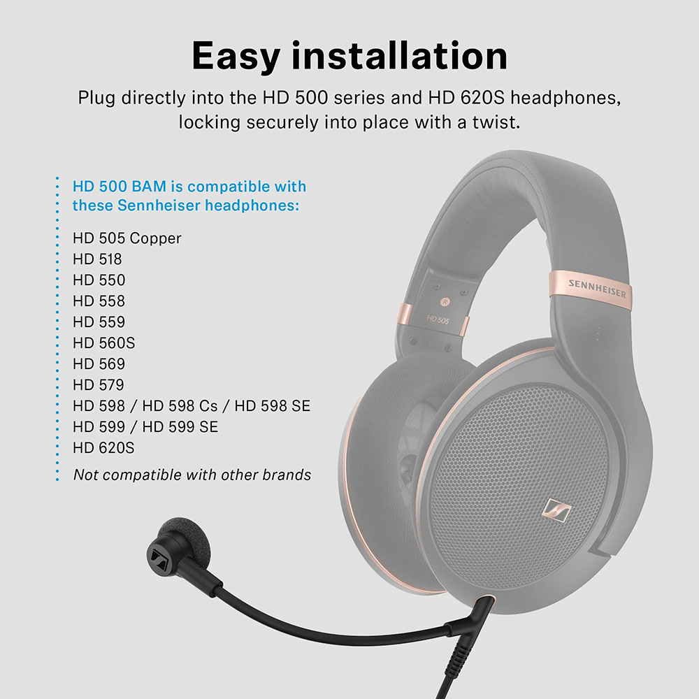 Sennheiser HD 500 BAM - додатковий мікрофон на гнучкому тримачі для навушників Sennheiser серії HD. HD 500 BAM швидко й просто перетворює ваші навушники на високоякісну повнофункціональну гарнітуру та дає змогу спілкуватися онлайн та грати в ігри без найменших перешкод та затримок, повною мірою насолоджуючись неперевершеним аудіофільським звуком, функціоналом та комфортом фірмових Sennheiser HD.