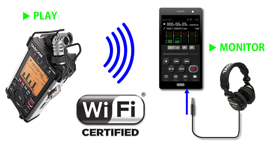 Окрім того, Tascam DR-44WLB має також вбудований модуль Wi-Fi, з котрим можна як передавати файли та транслювати потоковий звук у бездротовому режимі на смартфон чи інший сумісний мобільний пристрій, так і керувати рекордером дистанційно.